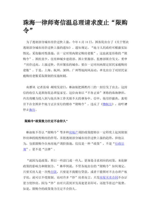 珠海一律師寄信溫總理請(qǐng)求廢止“限購(gòu)令”