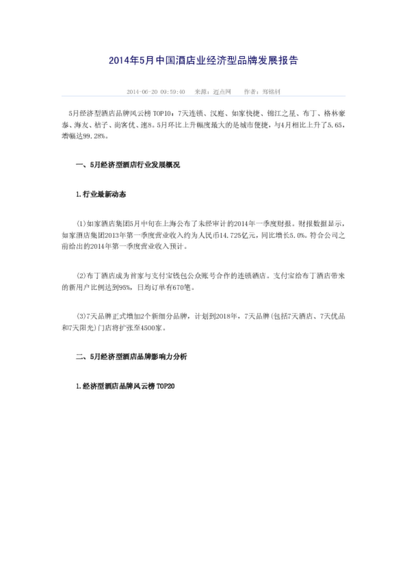 2014年5月中國酒店業(yè)經(jīng)濟(jì)型品牌發(fā)展報(bào)告